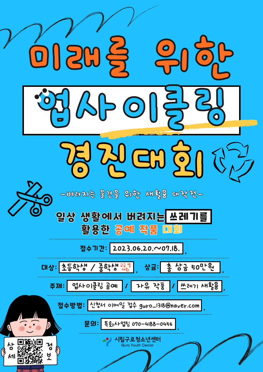 ½Ã¸³±¸·Îû¼Ò³â¼¾ÅÍ¿¡¼ Ãʵî~Áßµî û¼Ò³âµéÀ» ´ë»óÀ¸·Î ¾÷»çÀÌŬ¸µ °ø¿¹ °ø¸ðÀü ¡¸¹Ì·¡¸¦ À§ÇÑ ¾÷»çÀÌŬ¸µ °æÁø´ëȸ¡¹¸¦ ½Ç½ÃÇÕ´Ï´Ù. ¿ªÇÒÀ» ´ÙÇÏ°í ¹ö·ÁÁö´Â ¹°°ÇµéÀ» »õȰ¿ëÇϱâ À§ÇÑ Âü½ÅÇÑ ¾ÆÀ̵ð¾î¸¦ ã´Â À̹ø ¡¸¹Ì·¡¸¦ À§ÇÑ ¾÷»çÀÌŬ¸µ °æÁø´ëȸ¡¹¿¡ û¼Ò³âµéÀÇ ¸¹Àº °ü½É°ú Âü¿©¸¦ ¹Ù¶ø´Ï´Ù. ¢Ã °ø¸ðÁÖÁ¦ : ¾÷»çÀÌŬ¸µÀ» Ȱ¿ëÇÑ ÀÚÀ¯ ÀÛǰ(½É¹Ì¼ºÀ» °¡¹ÌÇÑ ÀÛǰ, ½Ç¿ë¼ºÀ» °®Ãá Á¦Ç° µî) ¢Ã ÀÛǰ¼ÒÀç : ÀÏ»ó»ýȰ¿¡¼ ¹ö·ÁÁö´Â ¾²·¹±â¸¦ Æ÷ÇÔÇÑ Àç·á ¢Ã °ø¸ðÀÚ°Ý : Ãʵî 1Çгâ ~ Áßµî 3ÇÐ³â ¹× µ¿ÀÏ¿¬·É û¼Ò³â ¢Ã Á¢¼ö±â°£ : 2023.06.20.(È) ~ 07.18.(È) 24:00±îÁö ¢Ã Á¢¼ö¹æ¹ý : À̸ÞÀÏ Á¢¼ö(guro_1318@naver.com) ¢Ã ½Ã»ó ³»¿ª : ÃÑ 18¸í(Ãʵî 9¸í, Áßµî 9¸í) ¡Û ´ë »ó Ãʵî·Áßµî °¢ 1¸í : »ó±Ý 10¸¸¿ø ¹× »óÀå ¡Û ÃÖ¿ì¼ö»ó Ãʵî·Áßµî °¢ 1¸í : »ó±Ý 6¸¸¿ø ¹× »óÀå ¡Û ¿ì ¼ö »ó Ãʵî·Áßµî °¢ 1¸í : »ó±Ý 3¸¸¿ø ¹× »óÀå ¡Û Àå ·Á »ó Ãʵî·Áßµî °¢ 6¸í : »ó±Ý 1¸¸¿ø ¹× »óÀå ¡Ø Á¡¼ö ¼øÀ§¿¡ µû¶ó ÃÖ°í µæÁ¡ÀÚ´Â ´ë»ó, ´ÙÀ½ ¼øÀ§(2À§) ÃÖ¿ì¼ö»ó, ´ÙÀ½ ¼øÀ§(3À§) ¿ì¼ö»ó, ´ÙÀ½ ¼øÀ§(4~9À§) Àå·Á»óÀ¸·Î Á¤ÇÔ. ¡Ø µ¿Á¡ ¹ß»ý ½Ã ¿¬¼ÒÀÚ °¡Á¡, °¡Á¡ Æ÷ÇÔ µ¿Á¡ÀÏ °æ¿ì ¼±Á¦Ãâ °¡Á¡ ¡Ø Àû°Ý ´ë»óÀÚ°¡ ¾øÀ» ½Ã ½É»ç °á°ú¿¡ µû¶ó ½Ã»ó ³»¿ª°ú ½Ã»ó Àοø º¯µ¿ °¡´É.