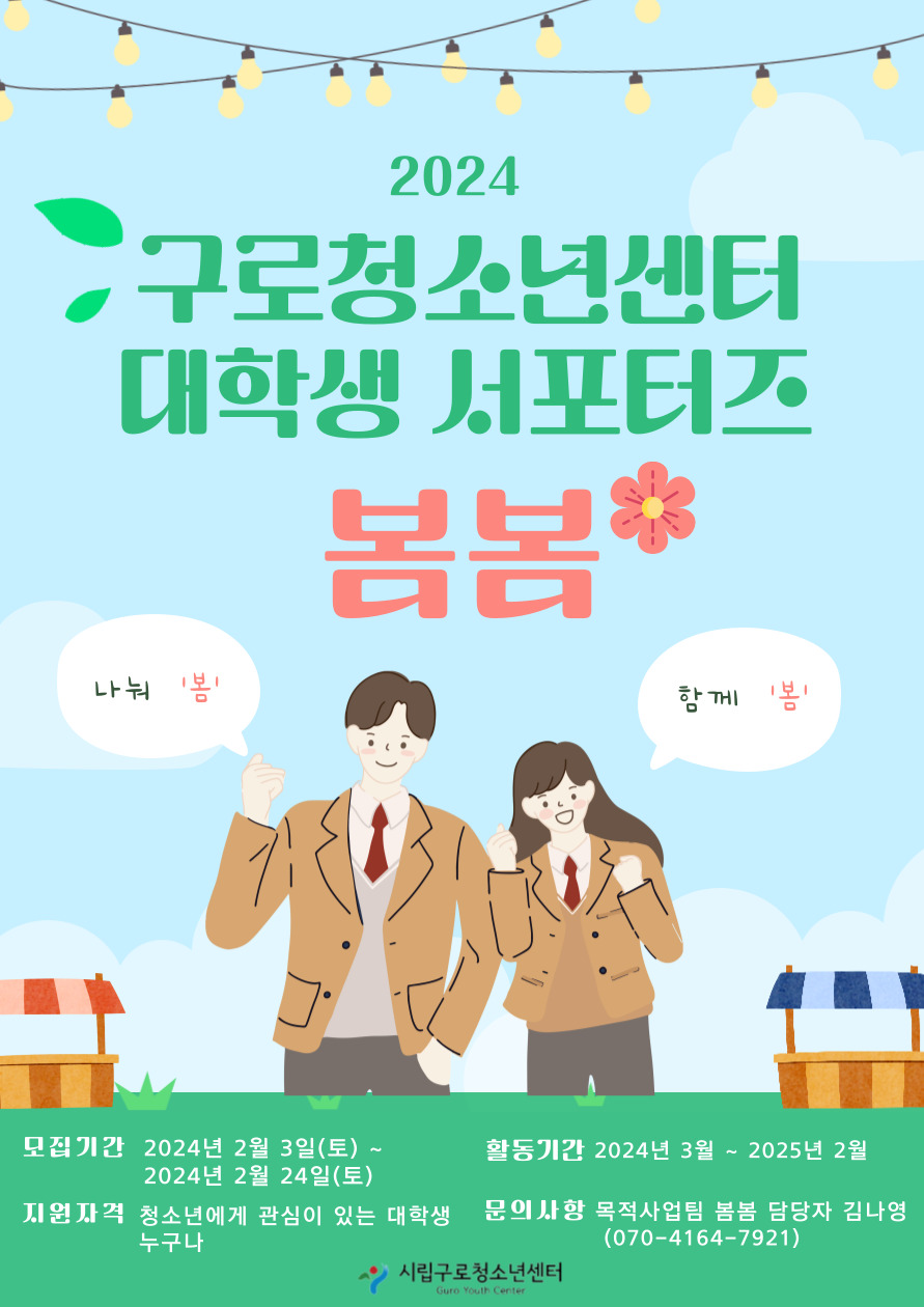 [´ëÇлý ¼Æ÷ÅÍÁî 'º½º½' ½Å±Ô µ¿¾Æ¸®¿ø ¸ðÁý] ¡á ¸ðÁý´ë»ó - ´ëÇб³ Àç(ÈÞ)Çлý - 2024. 3. 2.~2025. 3. 1. ¡á Ȱµ¿³»¿ë 1. ±¸·Îû¼Ò³â¼¾ÅÍ ¼Æ÷ÅÍÁî Ȱµ¿ 2. ¸Å´Þ ù°ÁÖ Åä¿äÀÏ(¿ÀÀü 10½Ã) Á¤±âȸÀÇ ¹× û¼Ò³â À̽´ ³ª´® 3. ¼¾ÅÍ ³»¹« û¼Ò³â Ȱµ¿ ±âȹ 4. ¼¾ÅÍ ÇÁ·Î±×·¥ Ȱµ¿ Áö¿ø ¡á Ȱµ¿ÇýÅà 1. û¼Ò³âÇаú Àü°ø½Ç½À 2. »çȸºÀ»ç, ±³À°ºÀ»ç ½Ã°£ ºÎ¿© 3. ÀÓ¸íÀå ¹× ¼ö·áÁõ ¼ö¿© ¡á ¸ðÁý¾È³» 1. Á¢¼ö±â°£: 2024. 2. 3.(Åä)~2. 24.(Åä) 2. ¸éÁ¢±â°£: 2024. 2. 26.(¿ù)~2. 29.(¸ñ) (¡Ø 1Â÷ ¼·ù ÇÕ°ÝÀÚ¿¡ ÇÑÇÏ¿© 2Â÷ ÃÖÁ¾ ¸éÁ¢À» À§ÇÑ ÀÏÁ¤Àº °³º° ¿¬¶ô µå¸³´Ï´Ù.) ¡á ¹®ÀÇ»çÇ× - 070-4164-7091(¸ñÀû»ç¾÷ÆÀ º½º½ ´ã´çÀÚ ±è³ª¿µ) |