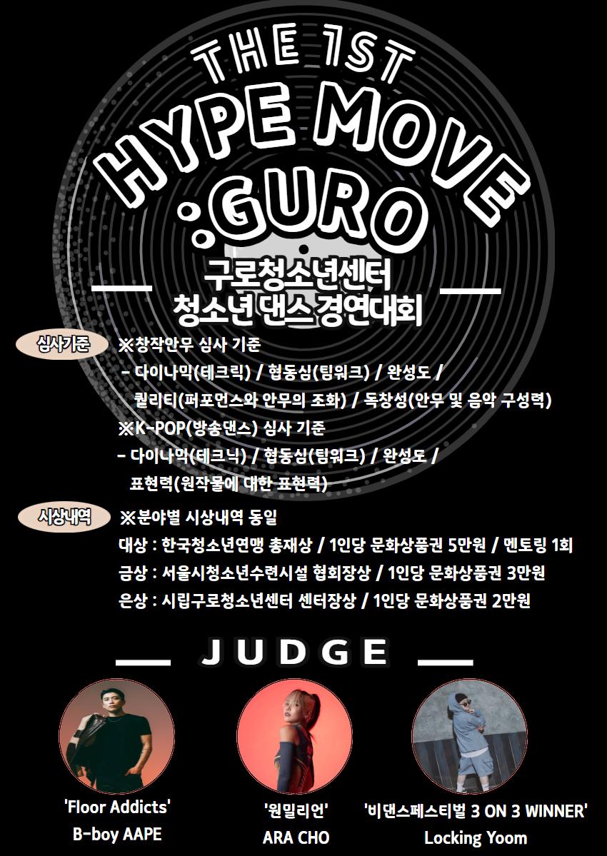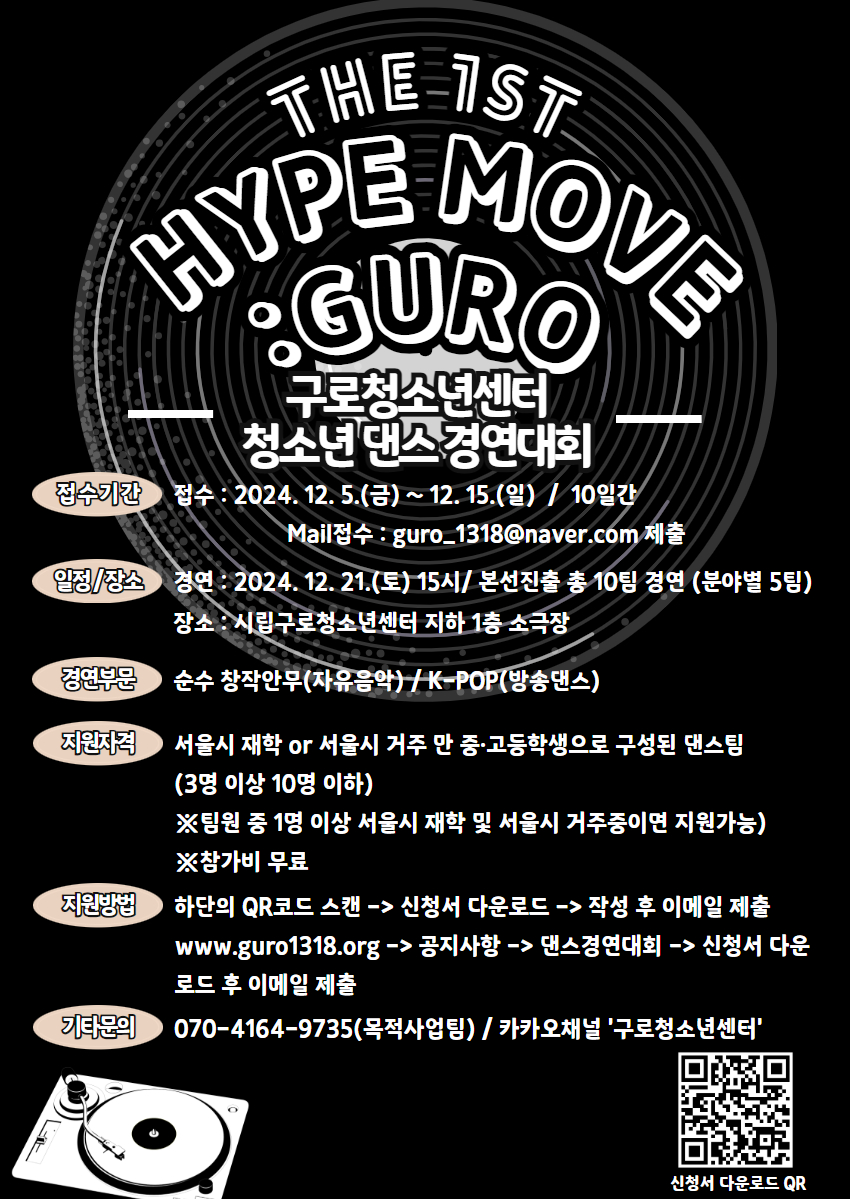 **Âü°¡ ½Åû ¹× Á¢¼ö** - ´ë »ó: ¼¿ï½Ã ³» 14~19¼¼ û¼Ò³âÀ¸·Î ±¸¼ºµÈ 3ÀÎ ÀÌ»ó 10ÀÎ ÀÌÇÏ ´í½ºµ¿¾Æ¸® ¹× ÆÀ (2011³â»ý~2006³â»ý ±âÁØ) - ±â °£: 2024³â 12¿ù 5ÀÏ(±Ý) ~ 12¿ù 15ÀÏ(ÀÏ) 23:59±îÁö **Âü°¡ÆÀ ¹ßÇ¥**: 2024³â 12¿ù 17ÀÏ(È), ´ëÇ¥ û¼Ò³â °³º° ¿¬¶ô ¹× ±¸·Îû¼Ò³â¼¾ÅÍ È¨ÆäÀÌÁö °Ô½Ã (www.guro1318.org) - Á¢¼ö ¹æ¹ý: À̸ÞÀÏ Á¢¼ö (À̸ÞÀÏ: guro_1318@naver.com) - À̸ÞÀÏ Á¦¸ñ ¾ç½Ä: [Hype Move_ÆÀ¸í]À¸·Î ÀÛ¼ºÇÏ¿© Á¦Ãâ - Á¦Ãâ ¼·ù - Âü°¡½Åû¼(°øÁö»çÇ× Ã·ºÎÆÄÀÏ ´Ù¿î·Îµå)