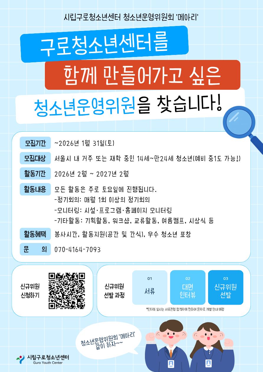 📌¸ðÁý±â°£ : ~1¿ù 31ÀÏ(Åä) 📌¸ðÁý´ë»ó: ¼¿ï½Ã ³» °ÅÁÖ ¶Ç´Â ÀçÇÐ ÁßÀÎ 14~¸¸24¼¼ û¼Ò³â(¿¹ºñ Áß1µµ °¡´É!!) 📌Ȱµ¿±â°£: 2026³â 2¿ù ~ 2027³â 2¿ù 📌Ȱµ¿³»¿ë: ¸ðµç Ȱµ¿Àº ÁÖ·Î Åä¿äÀÏ¿¡ ÁøÇàµË´Ï´Ù. - Á¤±âȸÀÇ: ¸Å¿ù 1ȸ ÀÌ»óÀÇ Á¤±âȸÀÇ - ¸ð´ÏÅ͸µ: ½Ã¼³¡¤ÇÁ·Î±×·¥¡¤È¨ÆäÀÌÁö ¸ð´ÏÅ͸µ -±âŸȰµ¿: ±âȹȰµ¿, ¿öÅ©¼¥, ±³·ùȰµ¿, ¿©¸§Ä·ÇÁ, ½Ã»ó½Ä µî 📌Ȱµ¿ÇýÅÃ: ºÀ»ç½Ã°£, Ȱµ¿Áö¿ø(°ø°£ ¹× °£½Ä), ¿ì¼ö û¼Ò³â ǥâ 📌¹®ÀÇ: 070-4164-7093 ✅ÀÎÅͺä ÀϽô ¼·ù ÇÕ°ÝÀÚ¿¡ ÇÑÇÏ¿© ¹®ÀÚ·Î °³º° ¾È³» ¿¹Á¤