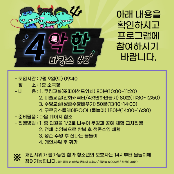 | û¼Ò³âÀü¿ë¿äÀÏÁ¦ ¿©¸§Æ¯º°ÇÁ·Î±×·¥'4¾ÇÇÑ ¹ÙIJ½º#2' ÀÌ¿ë¾È³» | |||