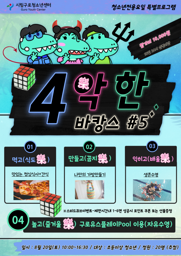 *ÀϽà : 8¿ù 20ÀÏ(Åä) 10:00~16:30 *Àå¼Ò : ±¸·Îû¼Ò³â¼¾ÅÍ °ü³» *³»¿ë : 1. °ø¿¹±³½Ç(³ª¸¸ÀÇ °¡¹æ¸¸µé±â) 2. Á¡½É½Ä»ç(°£´ÜÇÑ Á¡½ÉÁ¦°ø) 3. ºê·¹ÀνºÆ÷Ã÷(½ºÇǵåÅ¥ºêÀ̺¥Æ®-Á¦Çѽ𣠳» 1~6¸é ¼º°ø ½Ã Æ÷ÀÎÆ® ¶Ç´Â ¼±¹°Á¦°ø) 4. »ýÁ¸¼ö¿µÀÍÈ÷±â 5. ±¸·ÎÀ¯½ºÇ÷¹ÀÌPOOL(¹°³îÀÌ) *´ë»ó : ÃʵîÇлý ÀÌ»ó û¼Ò³â *Á¤¿ø : 20¸í(Ãß÷) *±Ý¾× : 10,000¿ø *½Åû : 2022. 8. 18. 24:00±îÁö / 8. 19. 09:-00 Ãß÷
