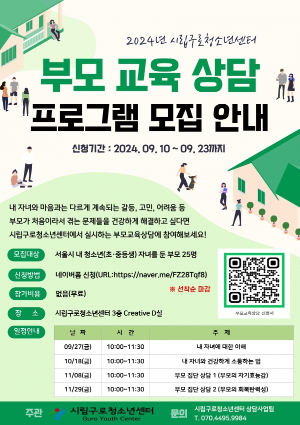 ³¯Â¥ | ½Ã°£ | ÁÖÁ¦ | 9/27(±Ý) | 10:00 ~ 11:30 | ³» Àڳ࿡ ´ëÇÑ ÀÌÇØ | 10/18(±Ý) | 10:00 ~ 11:30 | ³» ÀÚ³à¿Í °Ç°ÇÏ°Ô ¼ÒÅëÇÏ´Â ¹ý | 11/08(±Ý) | 10:00 ~ 11:30 | ºÎ¸ð Áý´Ü »ó´ã 1 (ºÎ¸ðÀÇ ÀÚ±âÈ¿´É°¨) | 11/29(±Ý) | 10:00 ~ 11:30 | ºÎ¸ð Áý´Ü »ó´ã 2 (ºÎ¸ðÀÇ È¸º¹Åº·Â¼º) |