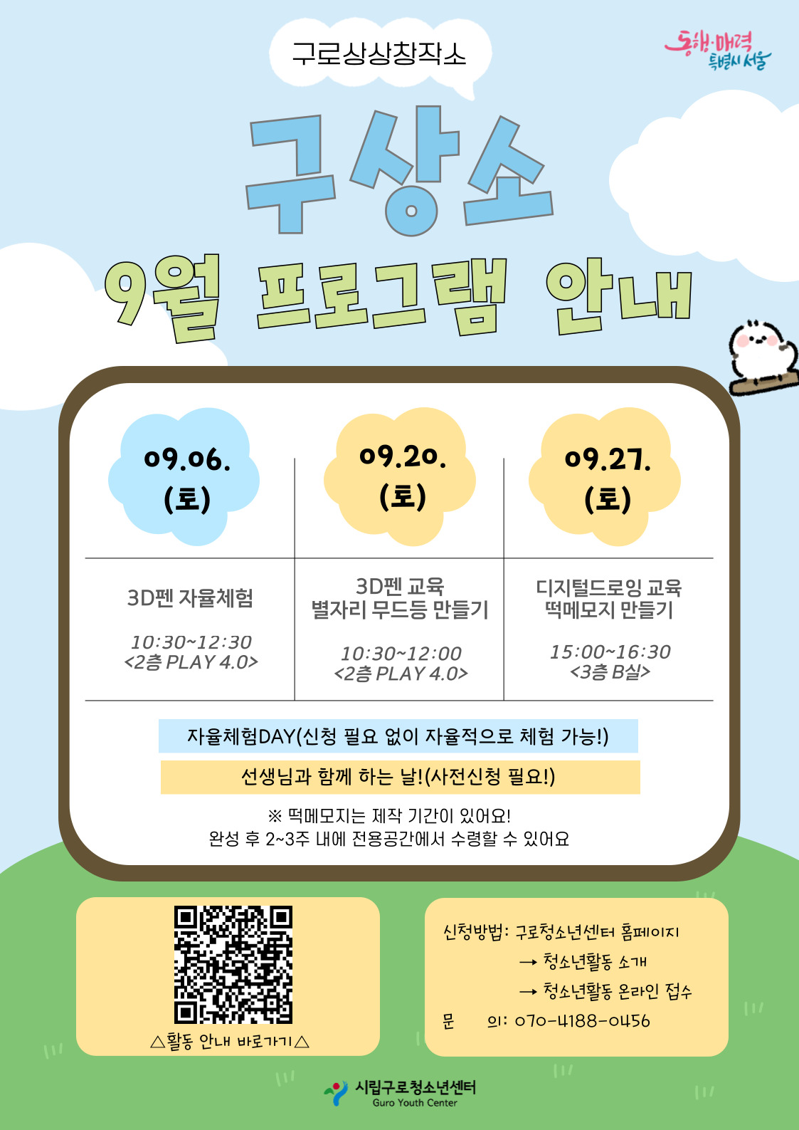 ✅ µðÁöÅеå·ÎÀ× ±³À° <¶±¸Þ¸ðÁö ¸¸µé±â> - ÀϽÃ: 09.27.(Åä) 15:00~16:30 - ´ë»ó: ÃÊ5 ÀÌ»ó 10¸í - Àå¼Ò: 2Ãþ PLAY 4.0 - µðÁöÅеå·ÎÀ× °æÇè Çʼö (1ȸ ÀÌ»ó Âü¿©ÀÚ, ÀÌÀü ¡®±¸»ó¼Ò µðÁöÅеå·ÎÀס¯ ÇÁ·Î±×·¥ À̼öÀÚ °¡´É) - Á¦ÀÛ ±â°£ÀÌ ÀÖ¾î¿ä! 2~3ÁÖ ³»¿¡ ¼ö·ÉÇÒ ¼ö ÀÖ¾î¿ä(°³º° ¹®ÀÚ Àü¼Û) - »çÀü ½Åû ÇÊ¿ä