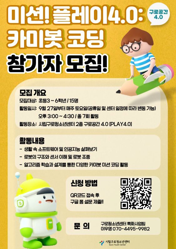 🎯 ¹Ì¼Ç! Ç÷¹ÀÌ 4.0 : Ä«¹Ìº¿ ÄÚµù Âü°¡ÀÚ ¸ðÁý±¸·Îû¼Ò³â¼¾ÅÍ ±¸·Î°ø°£ 4.0¿¡¼ Àç¹ÌÀÖ°í âÀÇÀûÀÎ ·Îº¿ ÄÚµù ÇÁ·Î±×·¥À» ÁøÇàÇÕ´Ï´Ù! ¾î·Á¿ï °Í °°Àº ÄÚµù! ·Îº¿°ú ÇÔ²² ½Å±âÇϰí Àç¹Õ´Â Ȱµ¿À¸·Î ÄÚµù°ú Ä£ÇØÁ®¿ä😁